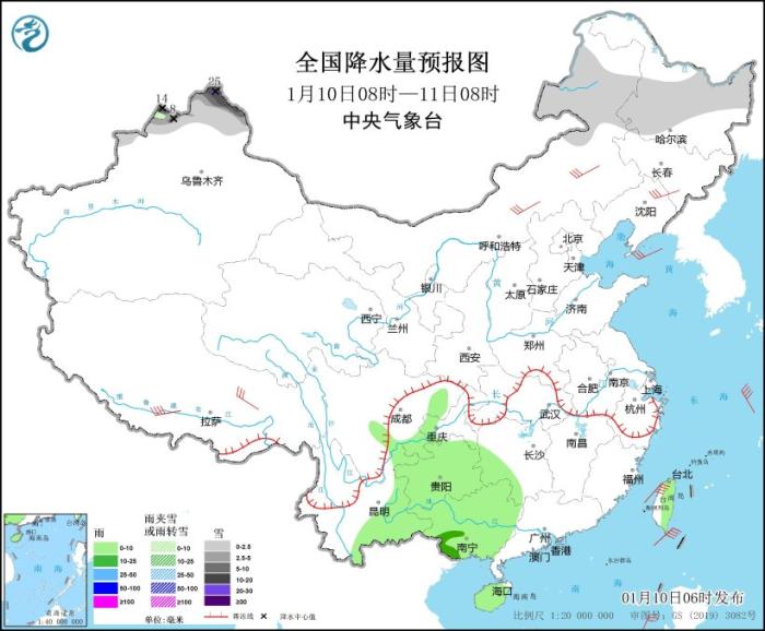 1月10日08時至11日08時,內(nèi)蒙古東部、黑龍江中北部、新疆北疆北部等地部分地區(qū)有小到中雪或雨夾雪,其中,新疆北疆塔城、阿勒泰地區(qū)等地有大到暴雪,局地大暴雪(20~25毫米)。四川盆地東南部、重慶西部、貴州、云南東部、廣西、湖南西南部、海南島、臺灣島東部等地部分地區(qū)有小到中雨。內(nèi)蒙古中部、遼寧北部等地部分地區(qū)有5~6級風;渤海、渤海海峽、黃海北部和南部、東海、臺灣海峽、臺灣以東洋面、巴士海峽、南海大部等海域有6~7級風、陣風8~9級。