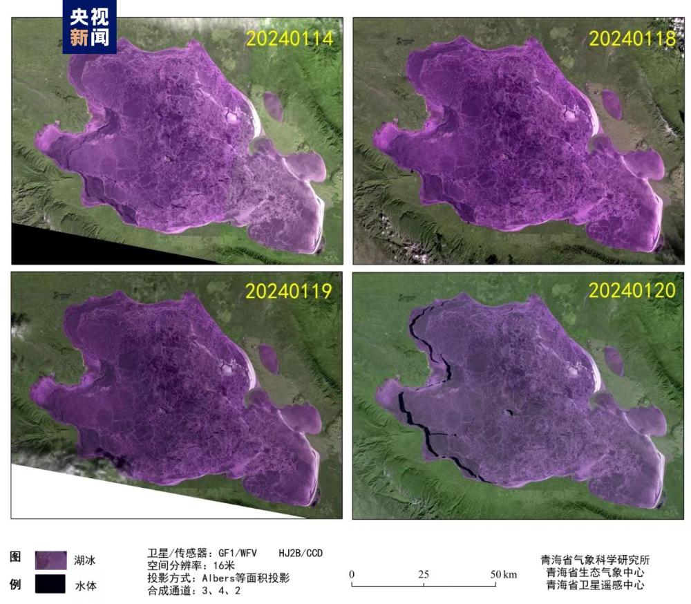 記者從青海省氣象局獲悉,衛(wèi)星遙感監(jiān)測(cè)顯示,1月14日起青海湖表面完全凍結(jié),依據(jù)《高原湖泊湖冰物候遙感監(jiān)測(cè)技術(shù)標(biāo)準(zhǔn)》(DB63/T1929-2021),湖泊表面連續(xù)5日完全被冰覆蓋的首日為完全凍結(jié)日,因此判定1月14日為青海湖完全凍結(jié)日。