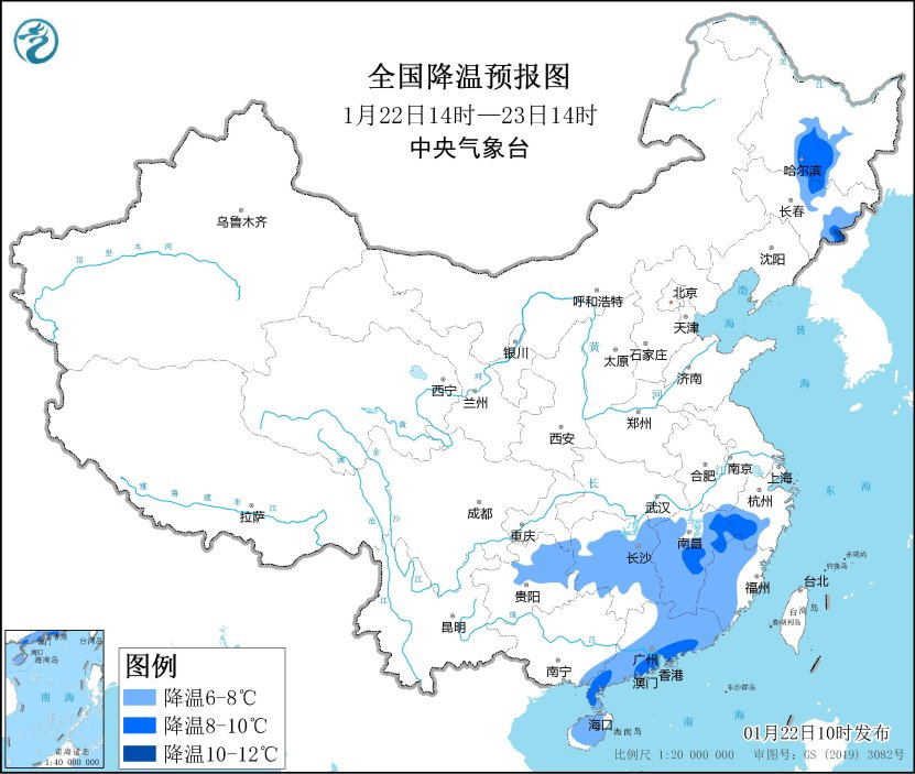 受寒潮影響,預(yù)計(jì),1月22日14時(shí)至1月23日14時(shí),黑龍江中部、吉林中東部、貴州東部、湖南中南部、江西、浙江西部、福建中西部、廣東東部和南部等地將降溫6~8℃,局地降溫超過(guò)9~10℃。23日至24日,最低氣溫0℃線將南壓到廣西北部和廣東北部一帶,江南、華南北部、貴州等地的最低氣溫可達(dá)-8~-1℃,華南中南部可達(dá)0~8℃。