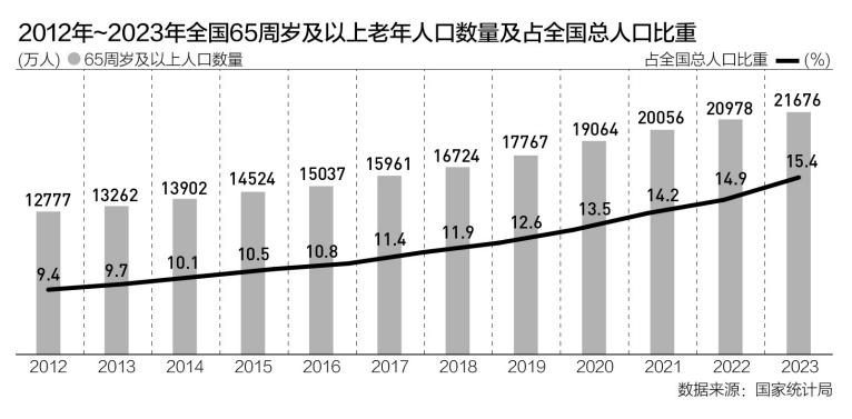 國家統(tǒng)計局發(fā)布最新人口數(shù)據(jù)顯示,60歲及以上人口29697萬人,占全國人口的21.1%,其中65歲及以上人口21676萬人,占全國人口的15.4%。根據(jù)聯(lián)合國關(guān)于老齡化的劃分標準,我國已經(jīng)進入了中度老齡社會。