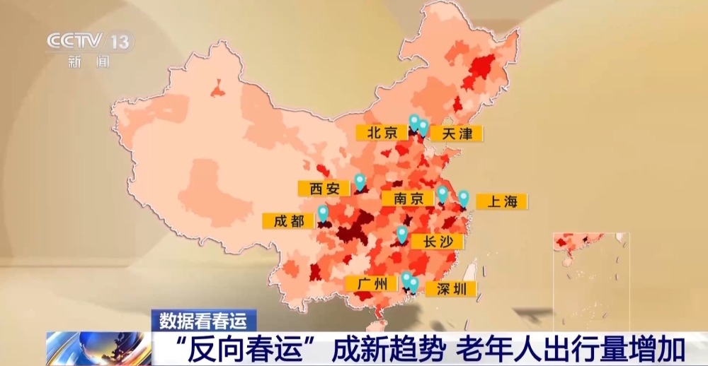 數(shù)據(jù)顯示,今年“反向春運(yùn)”趨勢明顯,更多的老年人選擇前往子女的工作地團(tuán)聚,他們的來源地主要集中在四川、河北、湖北、湖南等省份,而主要目的地則是北京、西安、天津、成都、廣州、上海、南京、深圳、長沙等一、二線中心城市。