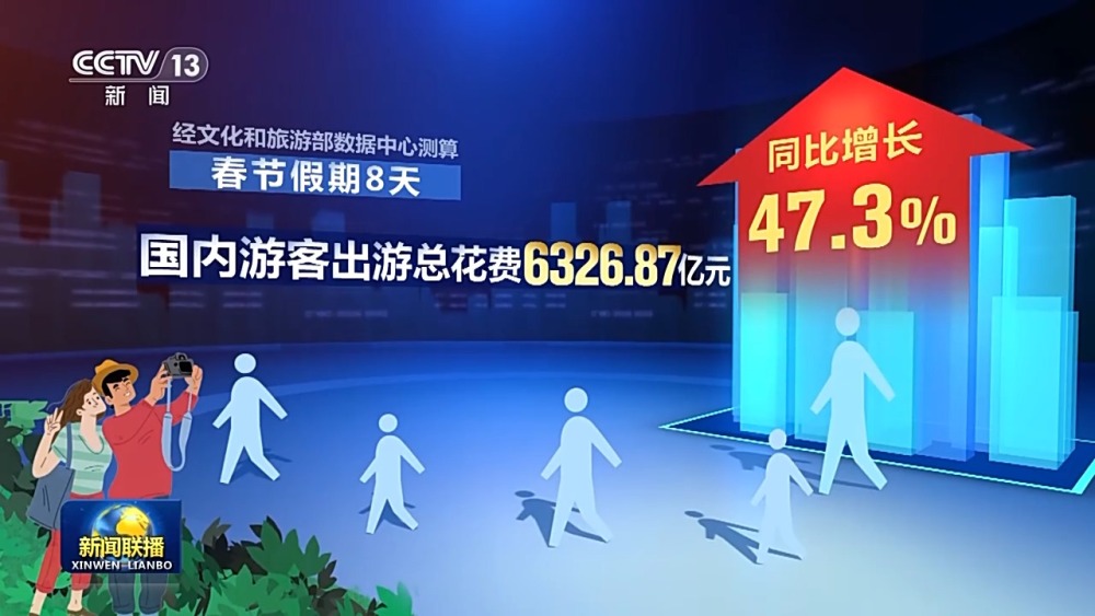 今年這個(gè)春節(jié),人們走得更遠(yuǎn),游玩時(shí)間更長(zhǎng)。出行平臺(tái)分析訂單數(shù)據(jù)后發(fā)現(xiàn),假期里,超過一半的人選擇跨省出游,其中三成以上的人選擇兩個(gè)及以上目的地,中國(guó)游客出境目的地覆蓋全球1700多個(gè)城市,個(gè)性化出游、定制化消費(fèi)成為新趨勢(shì)。在陜西景區(qū)里看一場(chǎng)沉浸式演出,游客既是觀眾,又是演員,全新消費(fèi)體驗(yàn)帶來上億元演出收入;四川把火鍋文化和特色觀光結(jié)合在一起,帶動(dòng)特色餐飲消費(fèi)熱度不斷。節(jié)日里,滕王閣景區(qū)北園向公眾開放,通過濱江水道,游客可以直接穿行老城區(qū)的商鋪。經(jīng)文化和旅游部數(shù)據(jù)中心測(cè)算,春節(jié)假期八天,全國(guó)國(guó)內(nèi)旅游出游4.74億人次,同比增長(zhǎng)34.3%,國(guó)內(nèi)游客出游總花費(fèi)6326.87億元,同比增長(zhǎng)47.3%。