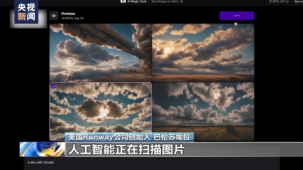 美國(guó)Runway公司創(chuàng)始人 巴倫蘇埃拉:讓我們做一個(gè)有云的天空,我可以選擇電影風(fēng)格或預(yù)覽角度。我真的很喜歡這張,它看起來(lái)就像光是從云里出來(lái)的。人工智能正在掃描圖片,并由此生成一段視頻。你現(xiàn)在可以看到云正在移動(dòng),天空正在變暗,暴風(fēng)雨就要來(lái)了。