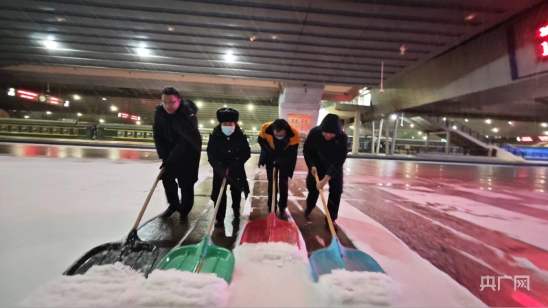 北京南站第一時間啟動預(yù)警和應(yīng)急響應(yīng),組織除雪突擊隊及時清掃站臺等處的積雪,確保旅客乘降安全。