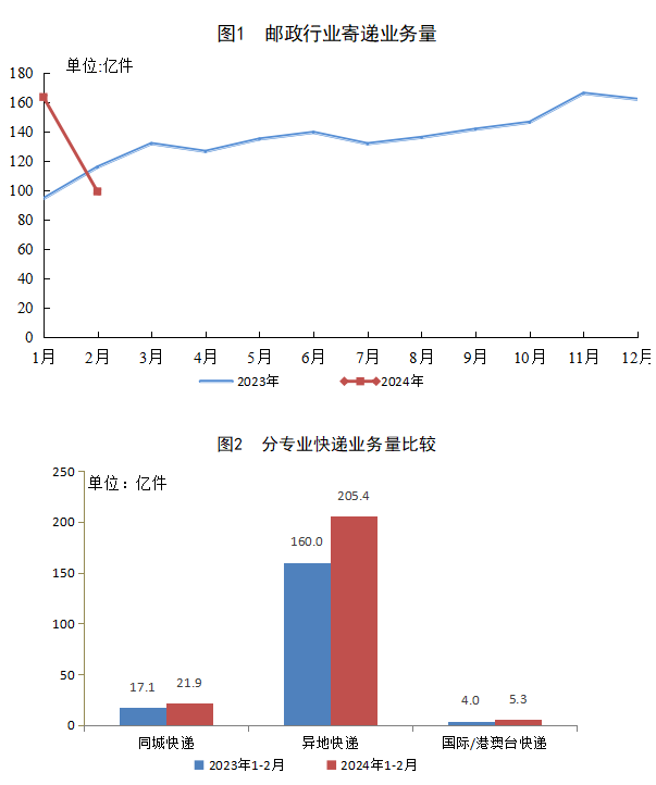 1-2月,同城快遞業(yè)務量完成21.9億件,同比增長28.3%;異地快遞業(yè)務量完成205.4億件,同比增長28.5%;國際/港澳臺快遞業(yè)務量完成5.3億件,同比增長31.9%。