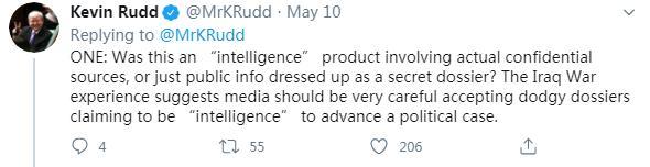 5月10日,陸克文在社交媒體再次連發(fā)五問,質(zhì)疑可能參與此次“甩鍋中國”事件的各方。他的第一問稱,這所謂的15頁“情報(bào)”,究竟是源于真實(shí)的絕密情報(bào),還是根據(jù)公開信息拼湊而成?他表示,“伊拉克戰(zhàn)爭的教訓(xùn)早已告誡媒體,必須謹(jǐn)慎對待所謂的‘情報(bào)’,以防陷入某種政治目的之中。”