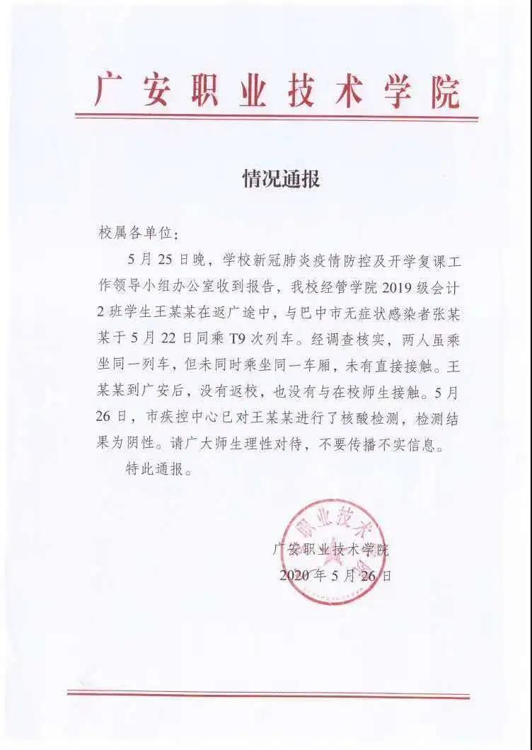 公告稱, 5月25日晚,廣安職業(yè)技術(shù)學(xué)院新冠肺炎疫情防控及開學(xué)復(fù)課工作領(lǐng)導(dǎo)小組辦公室收到報(bào)告,該校經(jīng)管學(xué)院2019級(jí)會(huì)計(jì)2班學(xué)生王某某在返廣(安)途中,與巴中市無癥狀感染者張某某于5月22日同乘T9次列車。經(jīng)調(diào)查核實(shí),兩人雖乘坐同一列車,但未同時(shí)乘坐同一車廂,未有直接接觸。王某某到廣安后,沒有返校,也沒有與在校師生接觸。5月26日,廣安市疾控中心對(duì)王某某進(jìn)行核酸檢測(cè),檢測(cè)結(jié)果為陰性。