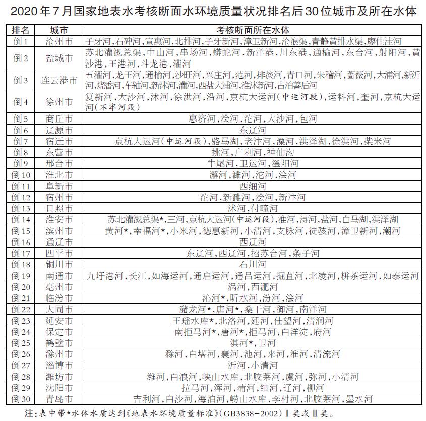參加排名的全國地級及以上城市,覆蓋2050個國控斷面(其中1940個為國家地表水考核斷面,110個為入??刂茢嗝妫?。7月,全國地級及以上城市中,河池、柳州、桂林等30個城市國家地表水考核斷面水環(huán)境質(zhì)量相對較好,滄州、鹽城、連云港等30個城市國家地表水考核斷面水環(huán)境質(zhì)量相對較差;1-7月,全國地級及以上城市中,張掖、金昌、柳州等30個城市國家地表水考核斷面水環(huán)境質(zhì)量相對較好,銅川、滄州、邢臺等30個城市國家地表水考核斷面水環(huán)境質(zhì)量相對較差。