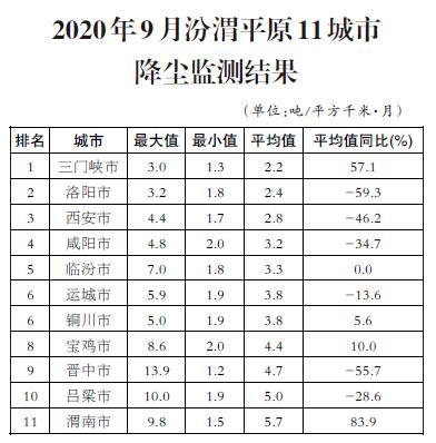 9月,汾渭平原11個城市降塵量均值范圍在2.2-5.7噸/平方千米·月之間,平均為3.8噸/平方千米·月,同比下降22.4%。汾渭平原11個城市降塵量平均值均小于9.0噸/平方千米·月。渭南、呂梁、晉中等3個城市降塵量最大值高于9.0噸/平方千米·月。三門峽、銅川、寶雞、渭南等4個城市降塵量平均值同比不降反升。