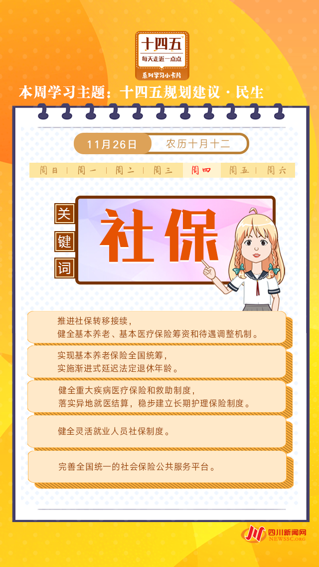本周學習主題“十四五規(guī)劃建議·民生”系列,一張張學習卡帶你了解就業(yè)、收入、住房……那些與你息息相關的民生舉措!今天打卡學習“十四五”規(guī)劃建議中有關社保的舉措。