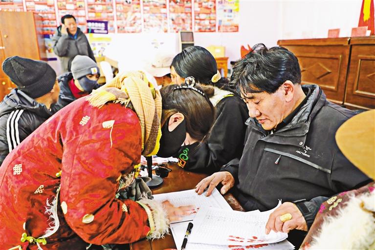 圖為圓夢新居社區(qū)群眾有序排隊、簽字、按手印,準(zhǔn)備領(lǐng)取分紅。 記者 達(dá)珍 永青 攝