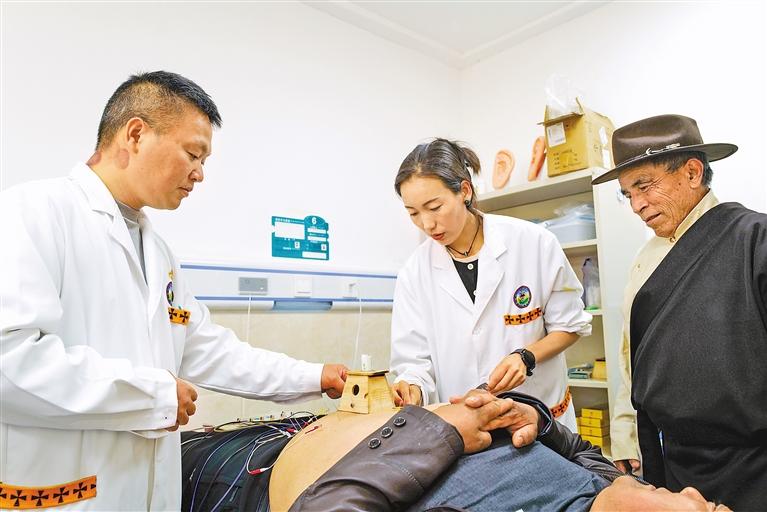 圖為在昌都市察雅縣藏醫(yī)院,重慶市大足區(qū)人民醫(yī)院援藏醫(yī)生(左)與藏醫(yī)院醫(yī)生結合中醫(yī)與藏醫(yī)療法,為患者進行診治。 記者 丹增群培 攝