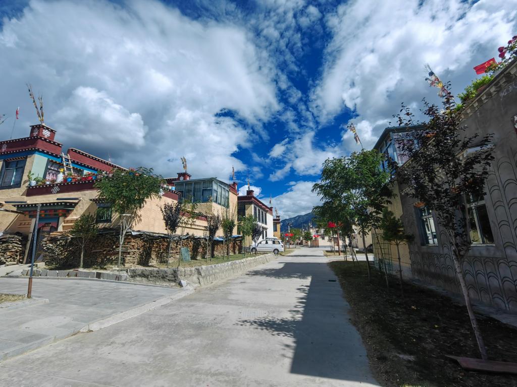 下山后的人們熱愛新家。許多人家在房頂插上國(guó)旗,在露臺(tái)上養(yǎng)花。達(dá)娃次仁被選為章達(dá)村黨支部書記。在他的帶動(dòng)下,告別了沙土的村民們每周一自發(fā)輪流打掃村子衛(wèi)生。
