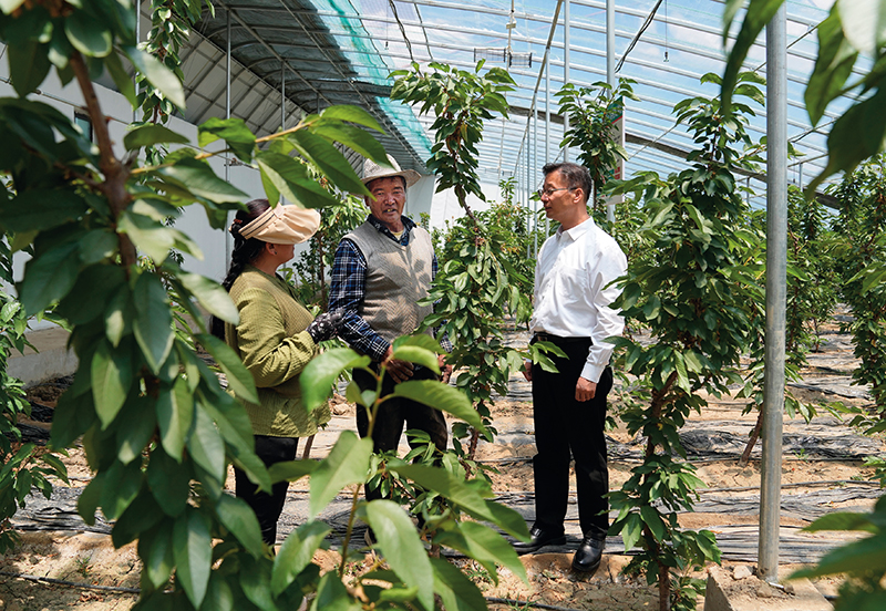 在西藏日喀則市白朗縣,李東(右一)在與當(dāng)?shù)胤N植戶交流(2024年6月21日攝) 丁汀攝
