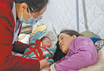1月10日,日喀則市定日縣人民醫(yī)院婦產(chǎn)科醫(yī)生在照看一對母子。這名新生兒在9日剛剛出生。本報記者 張武軍攝