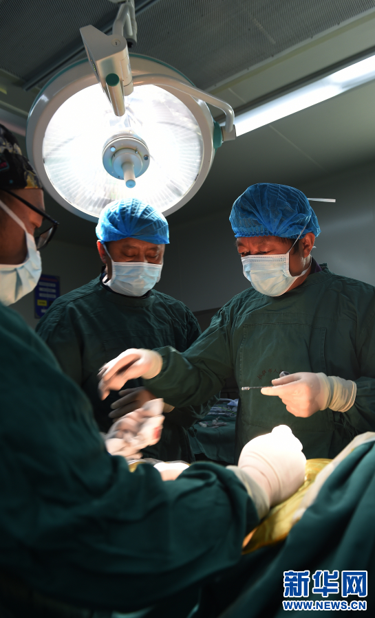 2017年5月26日,援藏醫(yī)生李家謀(右一)帶領(lǐng)拉薩市人民醫(yī)院的藏族醫(yī)生進(jìn)行脊柱微創(chuàng)手術(shù)。新華社記者 覺(jué)果 攝