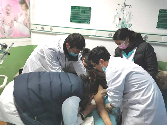 援藏醫(yī)療隊(duì)快速分工,組成新生兒復(fù)蘇團(tuán)隊(duì)。呼吸球囊尚未到位,孫豐濤毫不猶豫地為孩子實(shí)施口對(duì)口人工呼吸。徐鴻宇立即給予“雙拇指環(huán)繞法”胸外心臟按壓,縣醫(yī)院婦產(chǎn)科醫(yī)護(hù)人員積極協(xié)助。斷臍處理后,迅速將孩子移至暖臺(tái)保暖,繼續(xù)胸外心臟按壓、呼吸球囊面罩輔助呼吸。經(jīng)過(guò)分秒必爭(zhēng)的搶救,孩子心跳恢復(fù),全身皮膚轉(zhuǎn)紅潤(rùn),但呼吸和反應(yīng)仍然不好。經(jīng)過(guò)與家屬溝通,徐鴻宇給予氣管插管,繼續(xù)人工輔助通氣,并將孩子轉(zhuǎn)往上級(jí)醫(yī)院繼續(xù)治療。在此期間,產(chǎn)婦胎盤順利娩出,生命體征平穩(wěn)。