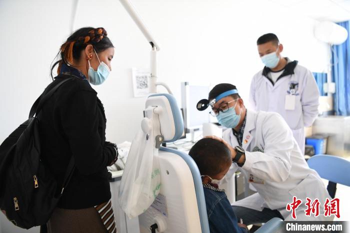 上海五官科醫(yī)院耳鼻喉科醫(yī)生曹鵬宇給藏族小朋友診病。 孫國(guó)根 攝