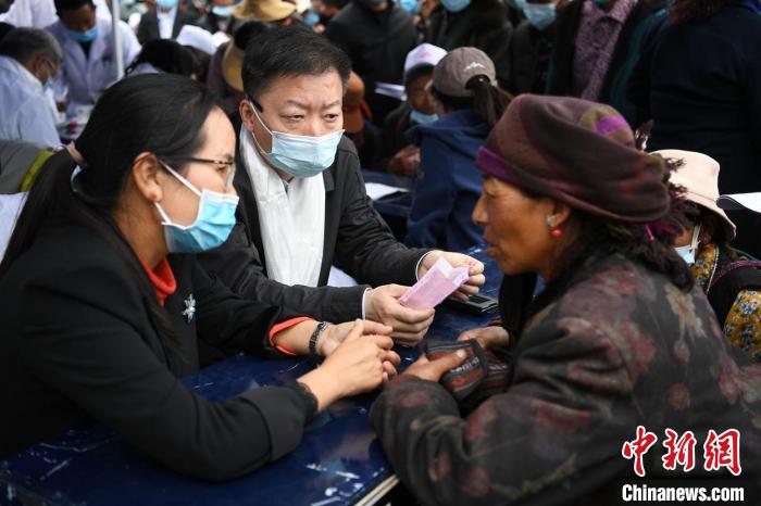上海新華醫(yī)院副院長(zhǎng)潘曙明教授在薩迦縣義診現(xiàn)場(chǎng)為藏族民眾診病?!O國(guó)根 攝
