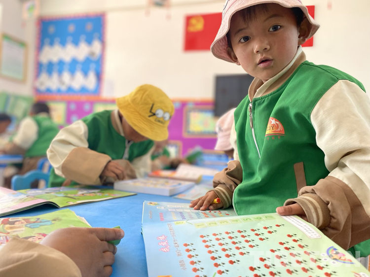 圖為西藏自治區(qū)日喀則市桑珠孜區(qū)江當鄉(xiāng)雷貴村幼兒園孩子們翻閱書籍 攝影:王媛媛