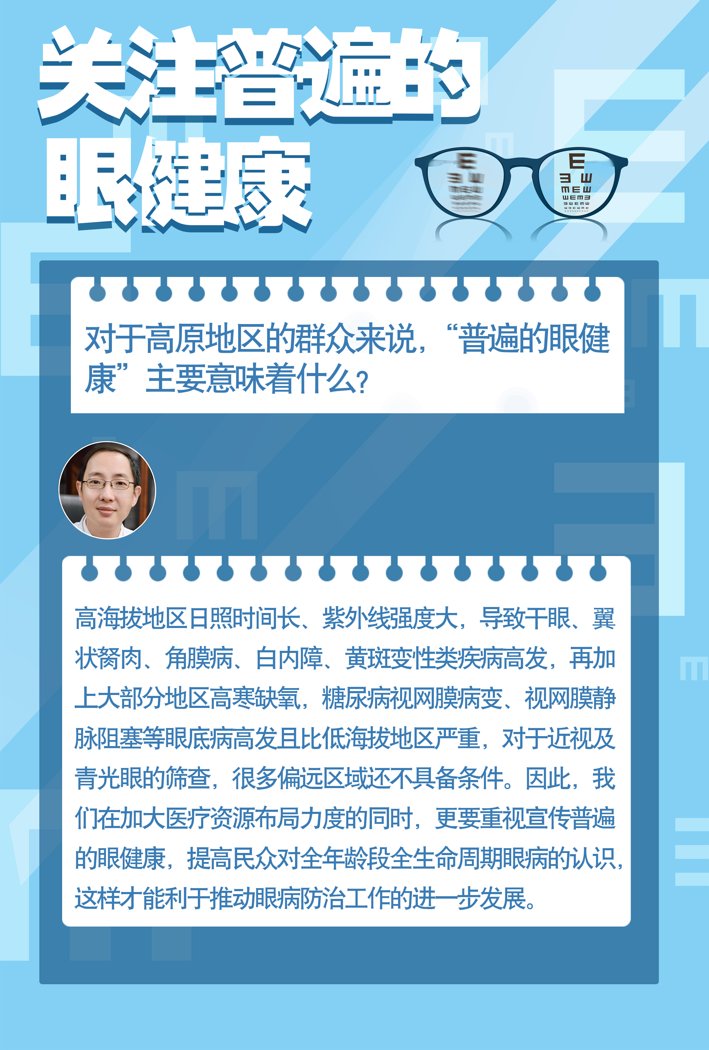 眼睛是人類感官中最重要的器官之一,也是人體最容易罹患疾病的器官之一。著重關注兒童青少年、老年人兩個重點人群,防治近視、白內(nèi)障、眼底病、青光眼、角膜盲等重點眼病,提高全社會對全年齡段全生命周期普遍眼健康的認識,尤為重要。