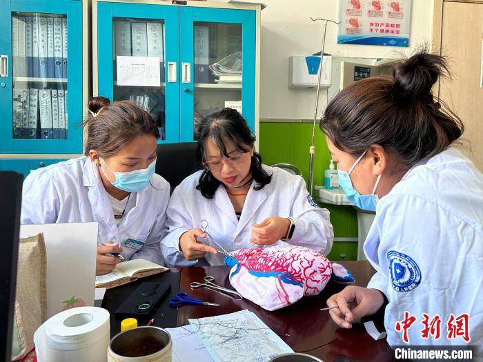 圖為許華(中)為聶拉木縣人民醫(yī)院醫(yī)生演示剖宮產(chǎn)手術(shù)止血方式。受訪者供圖