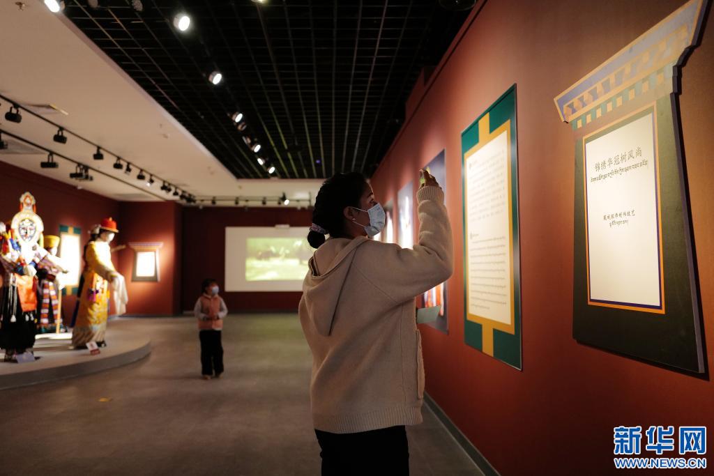 4月3日,一名小女孩在西藏牦牛博物館觀看拉薩市非物質(zhì)文化遺產(chǎn)代表性項目展。新華社記者 孫瑞博 攝
