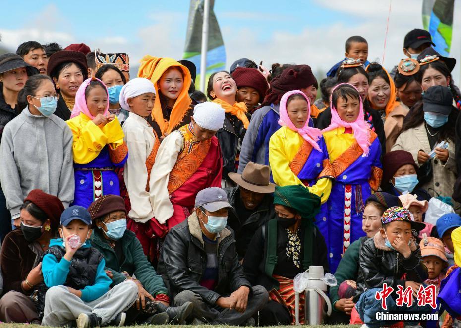9月23日,“中國農(nóng)民豐收節(jié)”西藏慶祝活動在拉薩市墨竹工卡縣舉行,當?shù)孛癖娸d歌載舞,慶?!柏S收節(jié)”。圖為慶?;顒游笈^眾。 中新社記者 貢嘎來松 攝