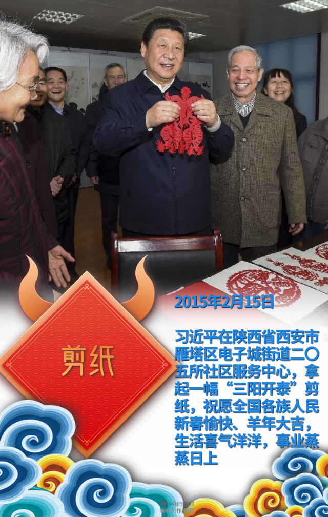 習(xí)近平在陜西省西安市雁塔區(qū)電子城街道二〇五所社區(qū)服務(wù)中心,拿起一幅“三陽(yáng)開(kāi)泰”剪紙,祝愿全國(guó)各族人民新春愉快、羊年大吉,生活喜氣洋洋,事業(yè)蒸蒸日上