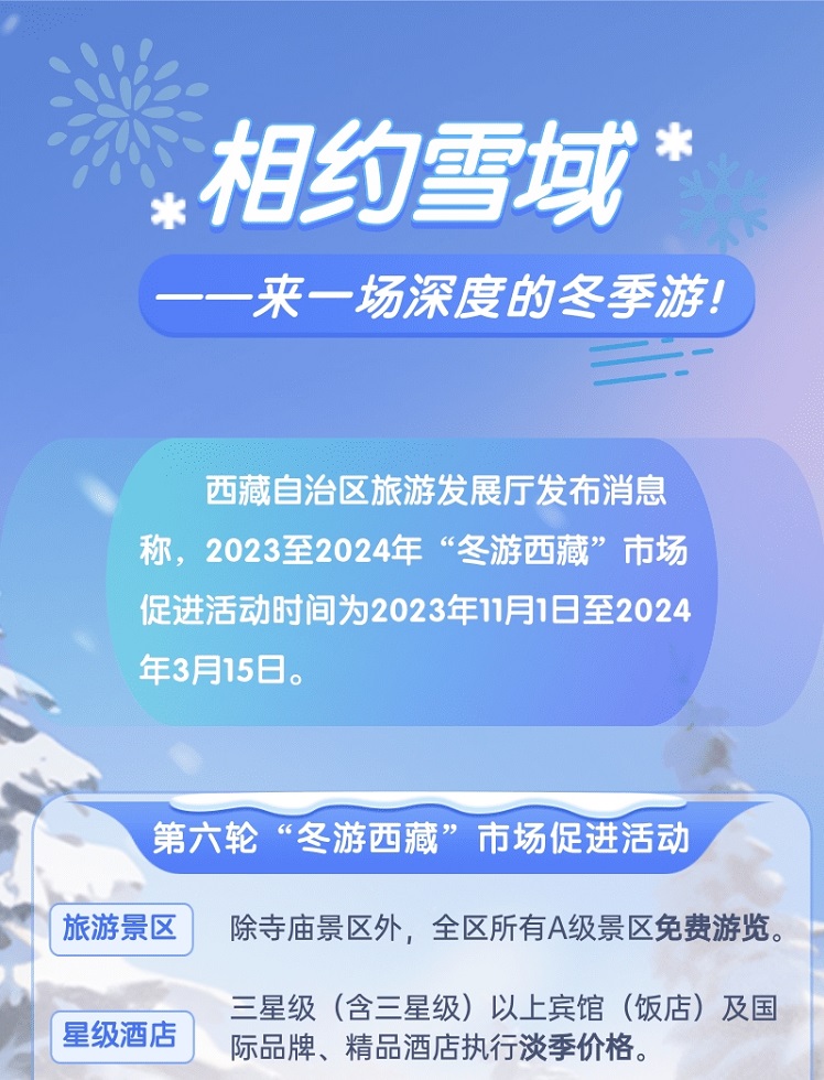 西藏自治區(qū)旅游發(fā)展廳發(fā)布消息稱,2023至2024年“冬游西藏”市場促進(jìn)活動時間為2023年11月1日至2024年3月15日。[詳細(xì)] -
