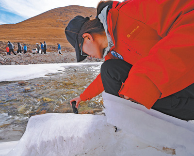 科研人員在冰面上取樣。記者 徐馭堯攝