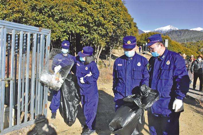 圖為林芝市消防救援支隊(duì)市區(qū)指戰(zhàn)員在清理生活垃圾。米次 攝