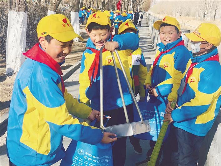 拉薩市城關(guān)區(qū)拉魯小學學生幫助環(huán)衛(wèi)工人清掃人行道