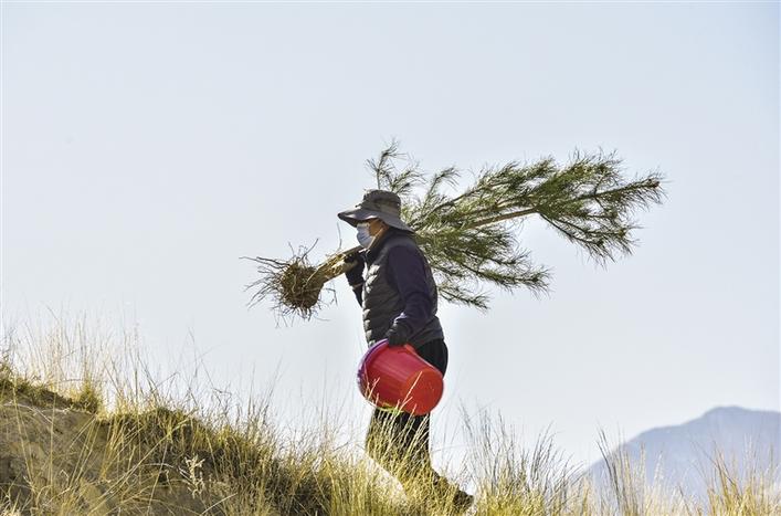 一株株新栽種的樹苗舒展身姿、迎風(fēng)挺立,在微風(fēng)中萌發(fā)盎然生機(jī),為春日的拉薩增添活力。