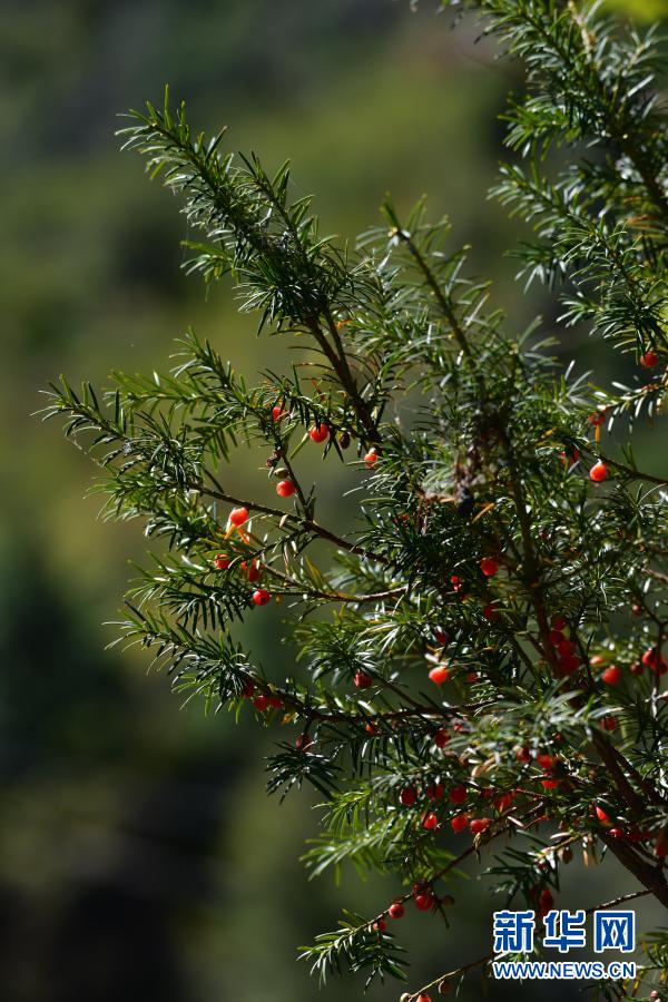 這是科研人員在西藏定日縣絨轄溝發(fā)現(xiàn)的密葉紅豆杉(2020年10月27日攝)?!⌒氯A社發(fā) 趙明旭 攝