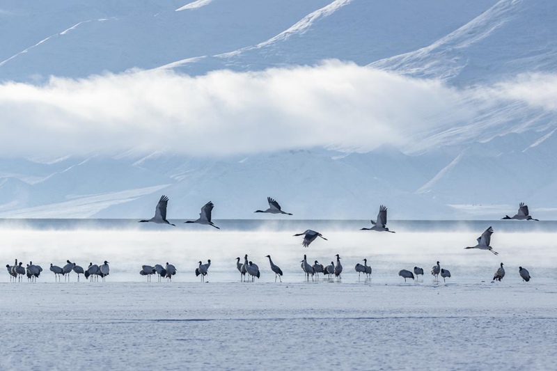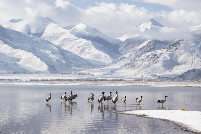 見(jiàn)過(guò)銀裝素裹的拉薩,但你一定沒(méi)見(jiàn)過(guò)在漫天白雪中盡情飛舞的黑頸鶴。茫茫天地間,優(yōu)雅的黑頸鶴沐浴著陽(yáng)光,直沖云霄。時(shí)值3月,在拉薩林周悠閑越過(guò)一冬的黑頸鶴,即將北上,開(kāi)始新一季的遷徙。這春雪,仿佛就是送給它的離別禮物。