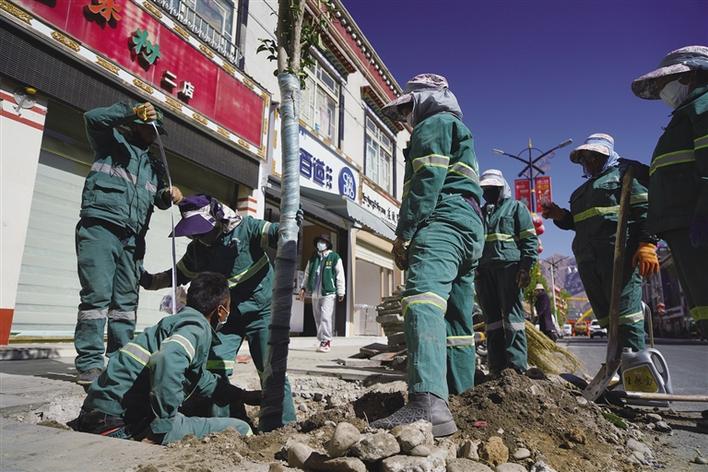 4月23日,記者在拉薩市朵森格路北段看到,道路兩旁正在栽種新樹(shù)木——大葉女貞。城關(guān)區(qū)潔達(dá)園林公司綠化二隊(duì)隊(duì)長(zhǎng)達(dá)娃告訴記者,因?yàn)槎渖衤繁倍蝺蛇叺你y杏樹(shù)高度過(guò)高,影響商鋪招牌與監(jiān)控拍攝,所以要進(jìn)行移栽。