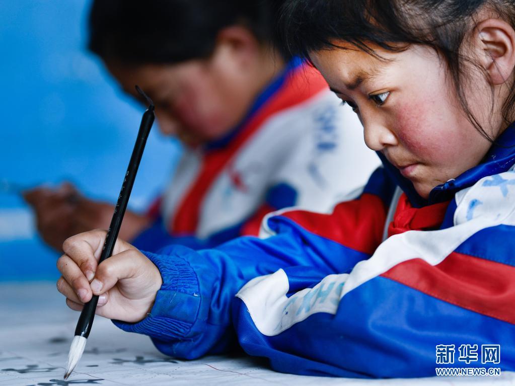 在玉樹藏族自治州紅旗小學(xué),學(xué)生在上書法課(3月19日攝)。新華社記者 張龍 攝