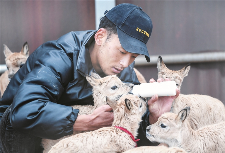 圖為可可西里國家級(jí)自然保護(hù)區(qū)卓乃湖保護(hù)站的工作人員才文多杰在給藏羚羊幼仔喂奶(2020年7月7日攝)。 新華社記者 薛玉斌攝