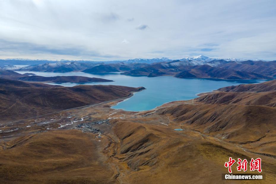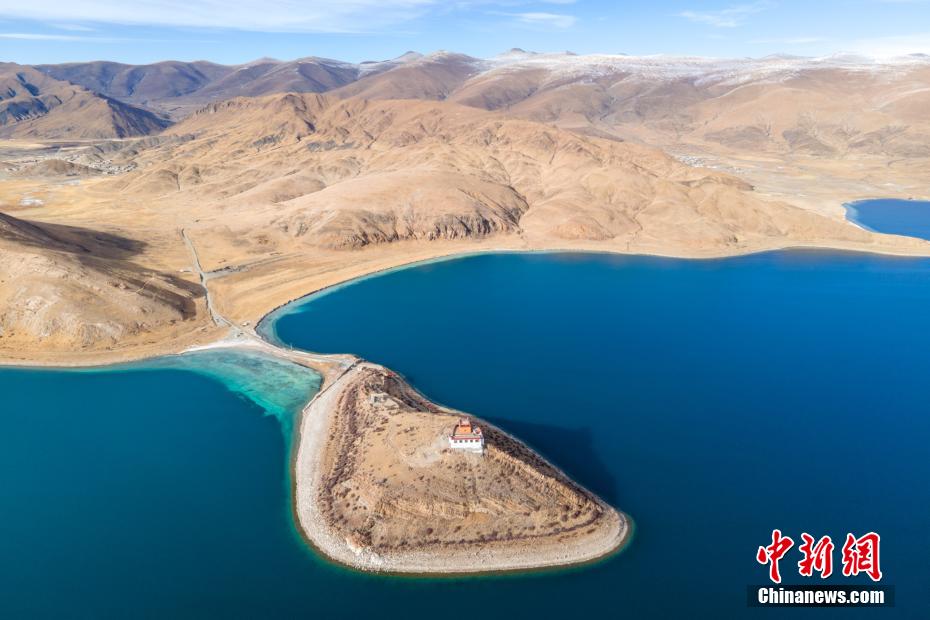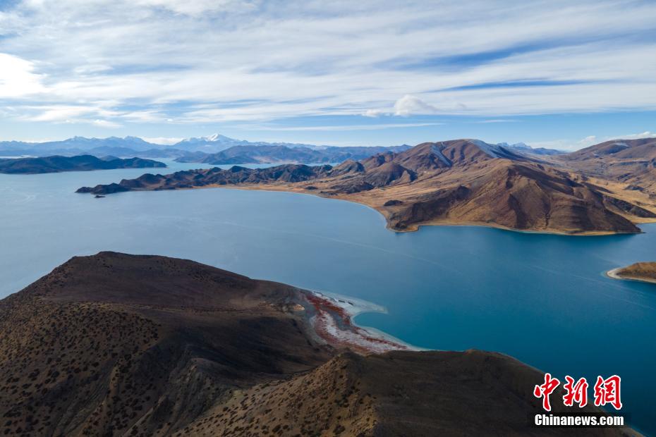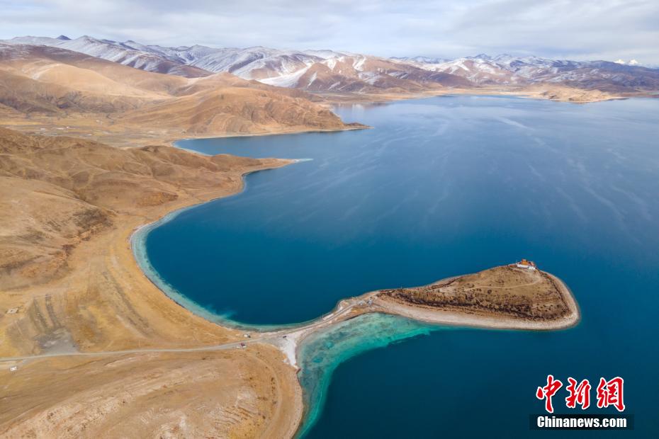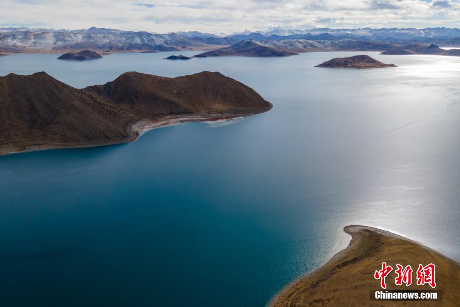 12月28日,羊卓雍錯(cuò)湖岸風(fēng)光。羊卓雍錯(cuò)藏語(yǔ)意為“碧玉湖”,與納木錯(cuò)、瑪旁雍錯(cuò)并稱西藏三大“圣湖”。羊卓雍錯(cuò)湖面海拔4441米,東西長(zhǎng)130公里,南北寬70公里,湖岸線總長(zhǎng)250多公里。28日,中新網(wǎng)記者自駕前往羊卓雍錯(cuò),翻過山口,到達(dá)湖岸東北面的日托寺,沿途盡是冬日高原湖光山色之美,無人機(jī)航拍鏡頭下,遠(yuǎn)處雪山、冰川巍峨屹立,堪稱絕美。 江飛波 攝