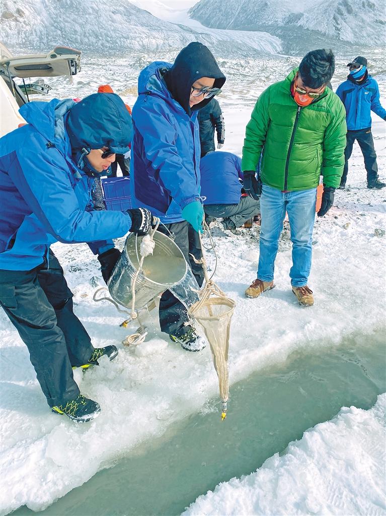 在姜根迪如冰川前的河道采取水生物樣本時,于愛琛要鑿開近10厘米的冰面,冰渣子進(jìn)入收集網(wǎng)里,又要用手取出來。即使戴著手套,刺骨的水溫也能通過手指使寒意襲遍全身,他整個手臂如同電量快耗盡的機器,緩慢機械地進(jìn)行著工作。但由于氣溫太低,沾了水的收集網(wǎng)很快又會被凍住,為了抓緊時間將樣本裝入瓶中,于愛琛索性取下手套,用開水將結(jié)冰的收集網(wǎng)融化,這一冷一熱間,整雙手早已麻木。當(dāng)時,于愛琛整個臉都是發(fā)腫鐵青的,紫黑色的嘴唇完全爆皮,說話時血從嘴唇皸裂處流出也不自知。