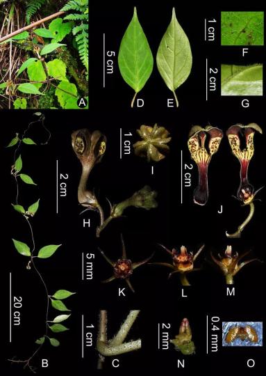 2021年7月中旬至8月初,由西雙版納植物園星耀武研究員率隊的聯(lián)合考察隊,對西藏日喀則地區(qū)喜馬拉雅南坡的維管植物進(jìn)行了考察和標(biāo)本采集??疾烊藛T在吉隆縣薩勒鄉(xiāng)發(fā)現(xiàn)一種正處于盛花期的吊燈花屬未知植物。通過解剖拍照、文獻(xiàn)查閱及相似種的模式標(biāo)本核對后,最終確認(rèn)為一新種。根據(jù)其模式產(chǎn)地,將其命名為吉隆吊燈花(Ceropegia jilongensis)。