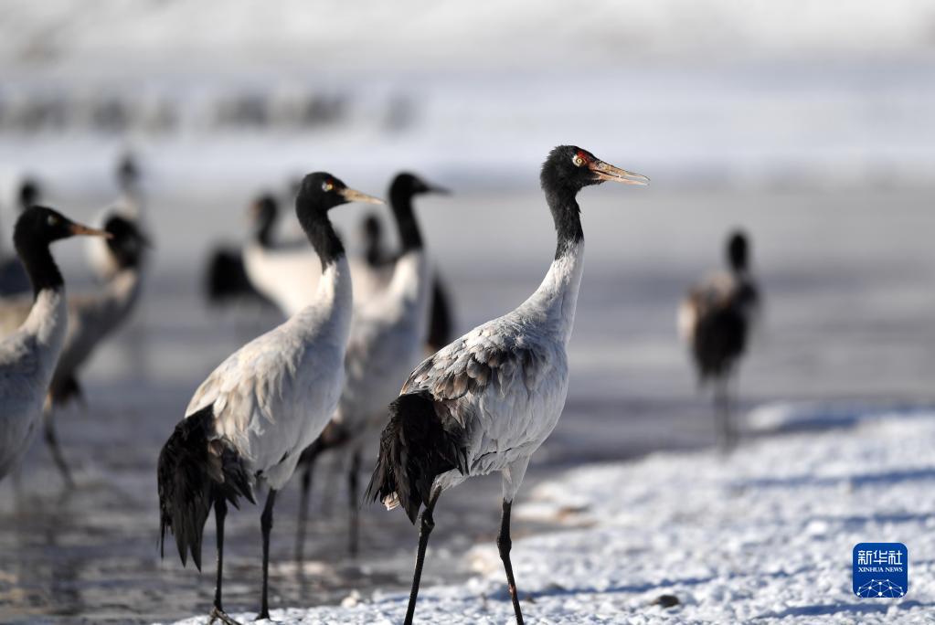 在拉薩市林周縣境內(nèi)越冬的黑頸鶴(2月22日攝)。新華社記者 姜帆 攝