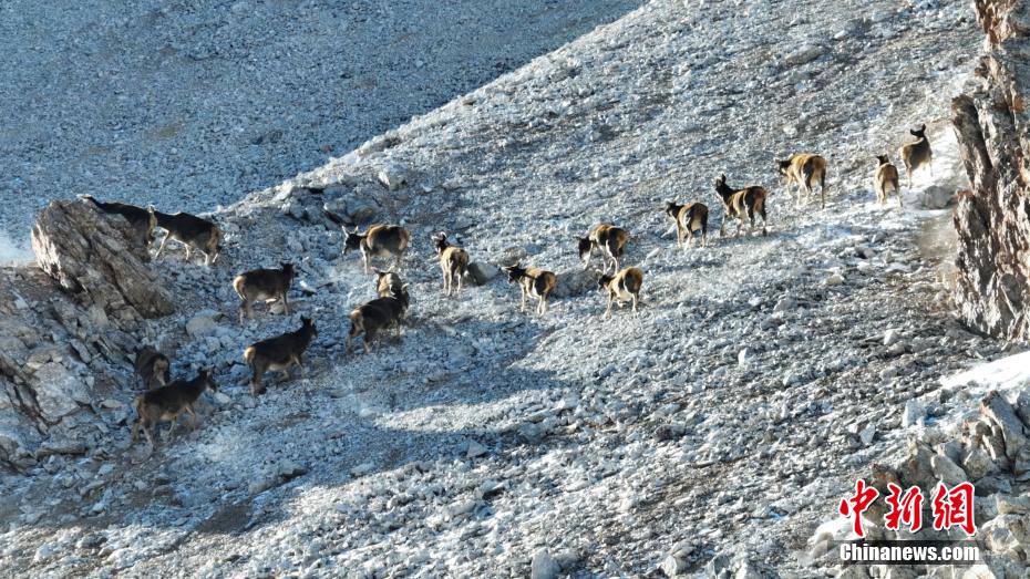 近日,甘肅省張掖市肅南裕固族自治縣祁連山國家公園祁青工業(yè)園區(qū)內,成群結隊的國家一級保護動物白唇鹿奔跑在山間,該白唇鹿種群有160余只,或走或立、悠閑覓食。白唇鹿棲息在海拔3000—5000米之間的高山草甸、灌叢和森林地帶,適應高寒氣候,是僅存于青藏高原的珍稀野生動物之一。武雪峰 攝