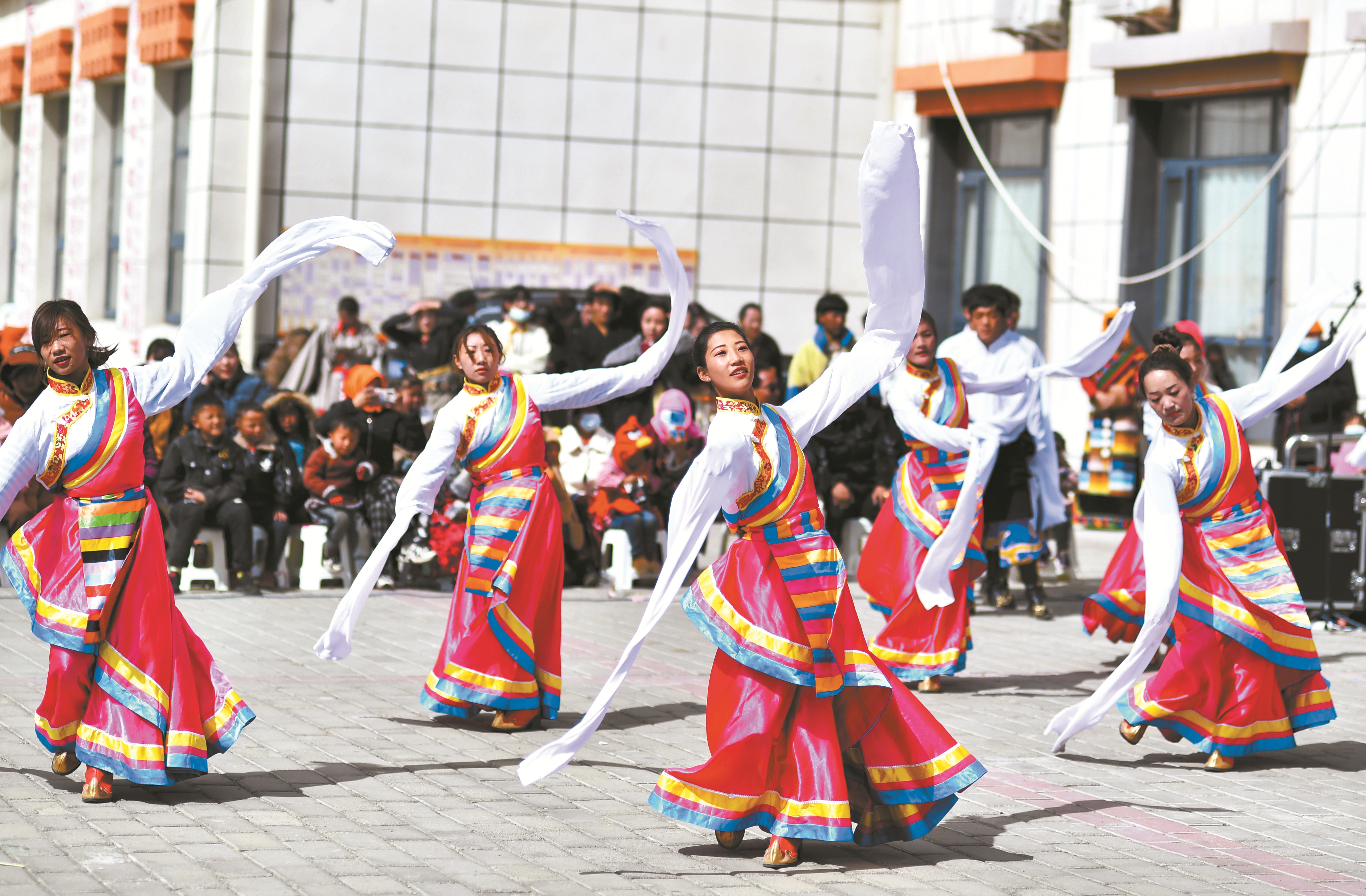 圖為搬遷牧民在搬遷點(diǎn)廣場(chǎng)上跳起民族舞蹈,迎接藏歷新年(2月28日攝)。新華社記者 覺 果攝