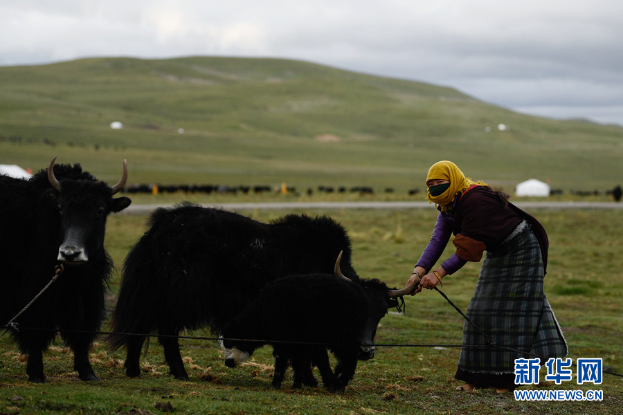 在果洛州瑪沁縣當洛鄉(xiāng)貢龍村的夏季草場上,牧民在拴牦牛。(資料圖)新華社記者 張龍 攝