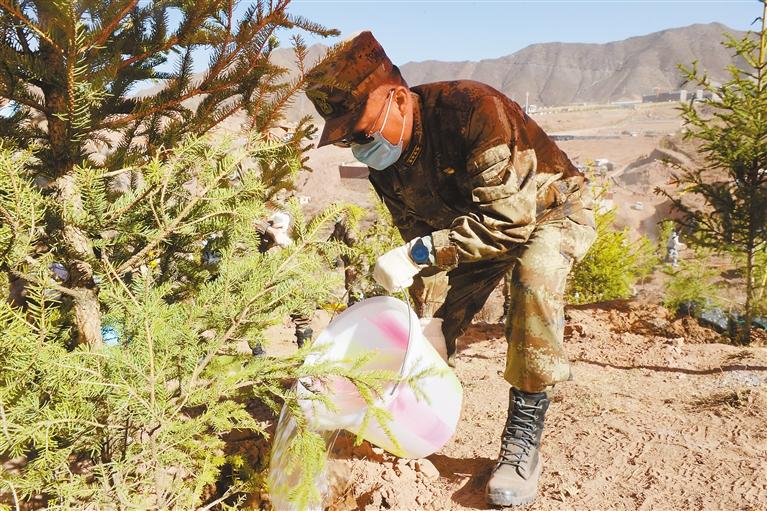 “挖坑、栽樹、修圍堰、立支架、澆水,這是植樹的五個步驟,植樹過程中最關(guān)鍵的是樹苗移植后的培土與澆水……”出發(fā)前,昌都軍分區(qū)宣傳保衛(wèi)科科長羅兵為官兵們詳細講解了植樹的要領(lǐng)。