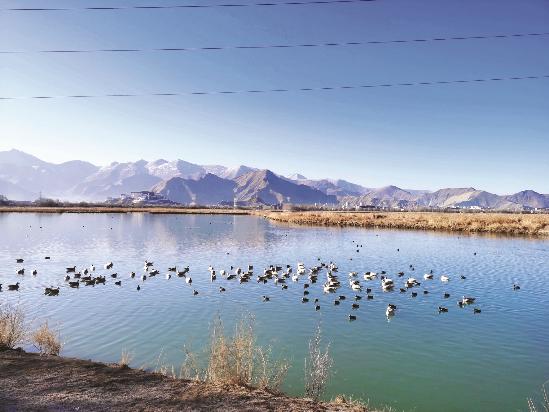 拉魯濕地內動物資源豐富,每年冬季11月份至次年4月份都會有大批候鳥來濕地越冬。圖為濕地成群的候鳥。 拉薩融媒記者 郝奕凝攝