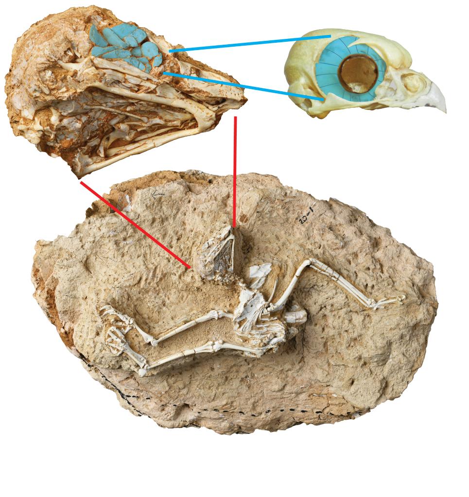日行中新猛鸮化石及眼部骨骼聚焦,藍色覆蓋處為鞏膜骨。(中科院古脊椎所供圖)