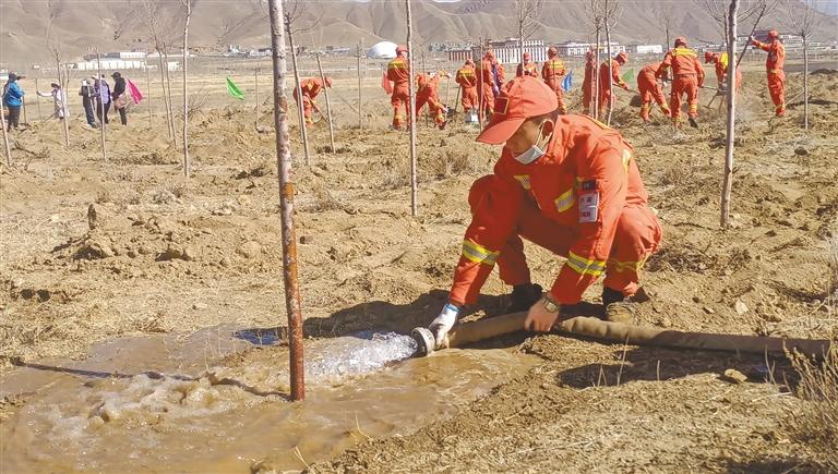 植樹造林不僅防止水土流失、調(diào)節(jié)氣候,同時(shí)也可以豐富生態(tài)資源,促進(jìn)經(jīng)濟(jì)發(fā)展等作用,是一項(xiàng)利于當(dāng)代、造福子孫的宏偉工程。春回大地萬(wàn)物蘇,植樹添綠正當(dāng)時(shí)。活動(dòng)現(xiàn)場(chǎng)消防救援人員精神飽滿、在大隊(duì)長(zhǎng)王治平的帶領(lǐng)下所有消防救援人員鼓足了干勁,大家相互結(jié)伴,揮動(dòng)著鐵鍬和鋤頭,挖坑、栽樹、覆土、澆水、齊心協(xié)力、配合默契,認(rèn)真細(xì)致地完成每一道工序,整個(gè)植樹活動(dòng)現(xiàn)場(chǎng)到處都是忙碌的身影?!翱油谏钜稽c(diǎn),這樣樹木才容易植活”,經(jīng)驗(yàn)豐富的二級(jí)消防士洛桑頓珠一旁耐心指導(dǎo)他的隊(duì)友?!皠?dòng)作麻利兒點(diǎn),不然完不成我們班今天的任務(wù)了”,該大隊(duì)四班班長(zhǎng)杜鵬給他的班級(jí)人員做動(dòng)員?!敖衲晔俏伊x務(wù)植樹第8年。近年來(lái),我們?nèi)湛t的綠化發(fā)展變化很大,作為土生土長(zhǎng)的日喀則人,我們要種好每一顆樹,愛(ài)護(hù)好每一棵樹苗,為日喀則綠化增添綠。”該大隊(duì)分隊(duì)長(zhǎng)嘎瑪赤烈說(shuō)道。
